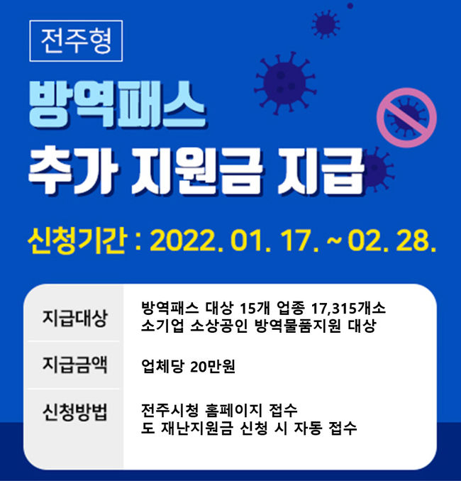 2022년 전주형 방역지원금은 △QR체크기 △손소독제 △마스크 등을 구입할 수 있도록 지급되며, 별도의 신청 없이 전라북도 방역지원금(80만 원)을 신청할 경우 자동으로 지급된다.