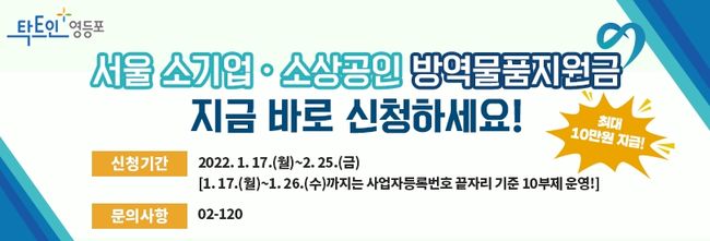 영등포구가 방역패스 제도의 확대로 어려움을 겪고 있는 소기업‧소상공인을 위해 최대 10만 원 상당의 방역물품 구입비를 지원한다고 밝혔다.