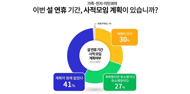 설 연휴 중 가족, 친지, 지인과의 사적모임 계획이 있느냐는 물음에는 응답자 30%가 ‘계획이 있다’고 답했다. ‘계획했지만 코로나19 확산으로 취소했거나 취소할 예정’이라는 답변은 27%, ‘계획이 원래 없었다’는 41%였다.