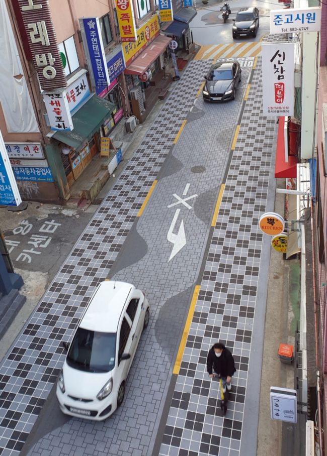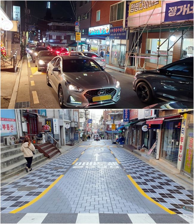 청룡길 보행자 중심 도로 개선 전(위), 후(아래) 모습