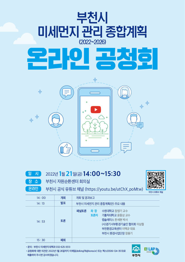 부천시는 오는 21일‘부천시 미세먼지 관리 종합계획(2022~2026) 수립을 위한 온라인 공청회’를 개최한다.