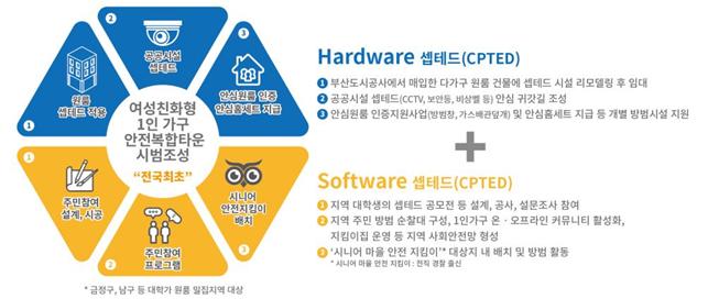 먼저, 부산도시공사에서 시행하는 다가구 매입임대사업에 선진 셉테드 시설을 융합한다. 셉테드 사업대상지 내 80가구(장전동 40가구, 대연동 40가구)를 우선 매입하고 현관출입통제시스템, 방범창, CCTV, 센서등, 스마트 초인종, 무인택배함 등 선진 방범시설을 설치·개보수해 청년 가구에 임대한다.