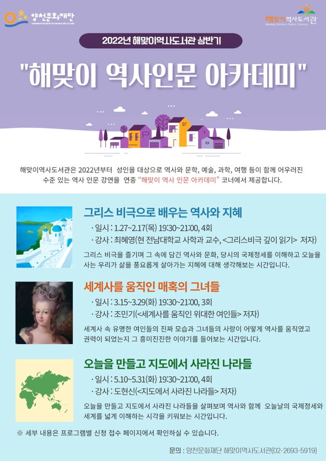 상반기에 진행될 ‘역사 인문 아카데미’와 ‘어린이 열매교실’의 수강을 희망할 경우 양천구통합도서관 홈페이지(해맞이역사도서관 메뉴)에 접속해 온라인으로 신청하면 된다. 각 프로그램의 세부 일정 등 자세한 사항은 해맞이역사도서관으로 문의하면 된다.