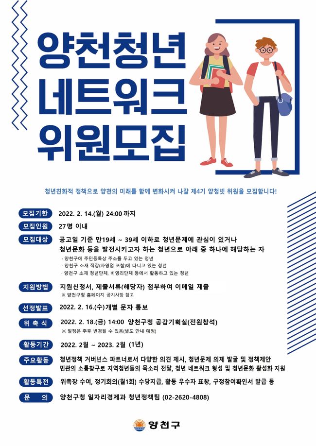 양천구가 2월 14일까지 ‘제4기 양천 청년 네트워크’ 위원을 공개모집한다.