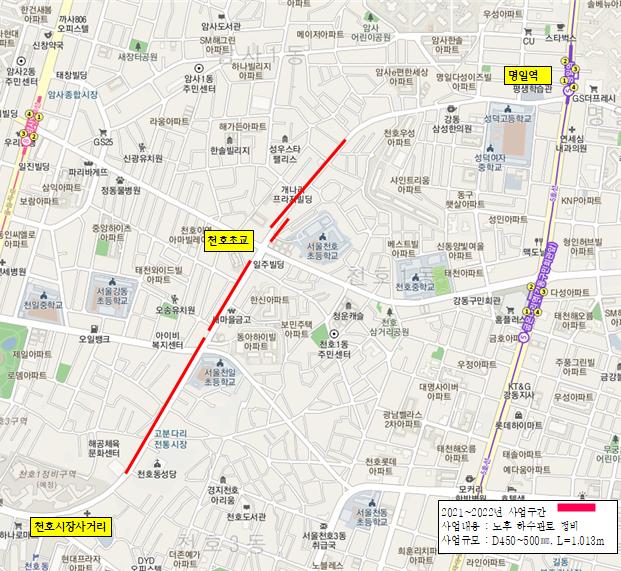 한편, 구는 명일역에서 천호초교사거리까지의 1차 지중화 공사가 완료되는 구간부터 굴착통제기간 이후 도로 포장 공사를 먼저 진행할 계획이며, 천호초교사거리에서 천호시장 사거리간 2차 지중화 사업 진행구간에 대하여도 최대한 빠른 포장 공사를 하여 구민 불편을 최소화할 계획이다.