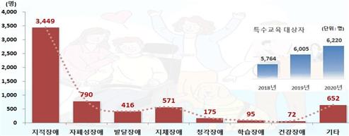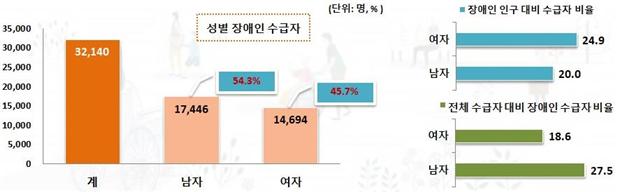 ▲2020년 장애인 인구는 146,321명으로 전년대비 1.2%(1,747명) 증가하였고, 시 전체 인구의 5.0%를 차지하며 지속적으로 증가하는 추세, ▲인천시 국민기초생활보장 수급자 142,628명 중 장애인 수급자는 32,140명으로 22.5% 규모, ▲장애유형별 특수교육 대상자는 총 6,220명으로 전년 6,005명 보다 3.6% 증가, ▲장애인 취업률은 전년 동분기 68.1%보다 3.6%p 증가한 71.7% 수준, ▲장애인 만성질환(6종) 진료인원은 88,970명(치주질환 42,408명, 고혈압 34,895명, 관절염 22,531명 순)이며, 1인당 연평균 진료비는 1,231천원, ▲장애인 거주 시설 수는 총 66개소이고, 전체 정원 933명 중 현원은 826명으로 정원대비 현원 비율은 88.5%를 차지했다.