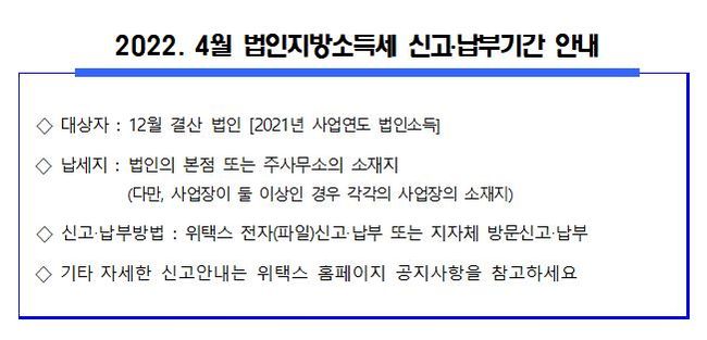 법인지방소득세는 신고세목으로 법인은 직전년도 말 결산한 사업소득에 대하여 신고해야 하며 법인세는 3월 31일까지, 법인지방소득세는 4월 30일까지 납부해야한다.