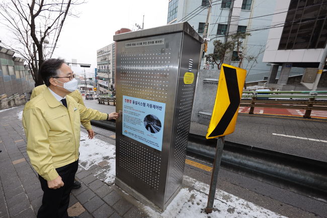 유성훈 금천구청장이 시흥동 금하로 급경사 지역에 설치된 도로열선 제어시스템을 점검하고 있다