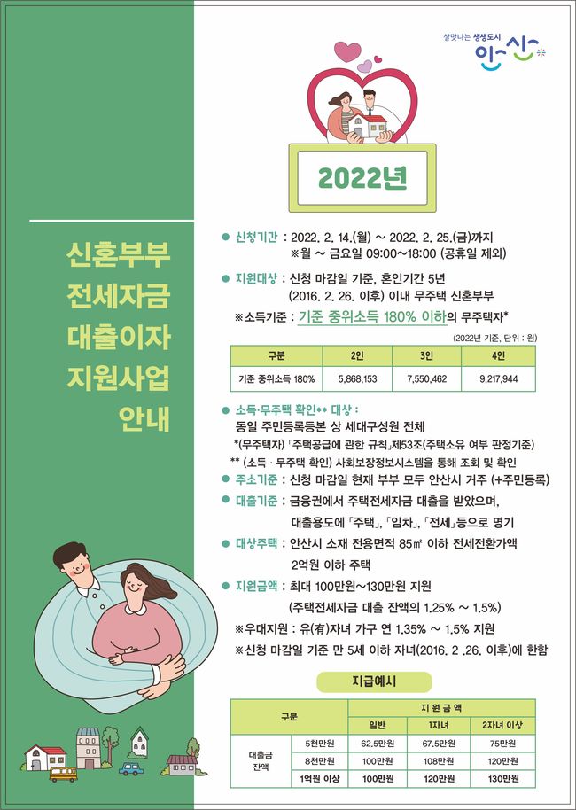 안산시는 다음달 14~25일 ‘2022년 신혼부부 전세자금 대출이자 지원 사업’ 희망자를 모집한다고 24일 밝혔다.
