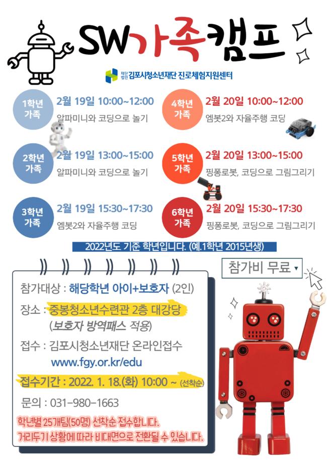 (재)김포시청소년재단 진로체험지원센터는 겨울 방학을 맞이하여 ‘가족이 함께하는 SW(소프트웨어) 캠프’를 주최한다. 초등학생을 대상으로 진행되는 이번 캠프는 학년별로 운영되므로 최대한 참가자 수준에 맞게 진행될 수 있을 것으로 예상된다.