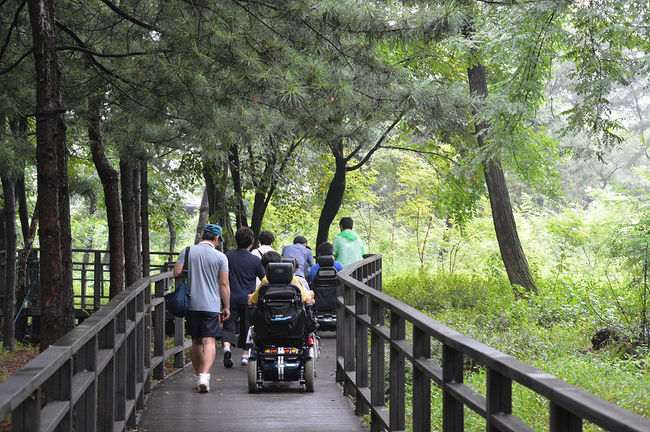 전동보장구를 타고 무장애숲길을 체험중인 구민의 모습