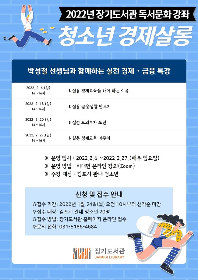 김포시 장기도서관은 2022년 2월 6일부터 2월 27일(매주 일요일) 오후 14시부터 16시까지 총 4회에 걸쳐 김포시 청소년을 대상으로 `청소년 경제 살롱` 강연을 운영한다.