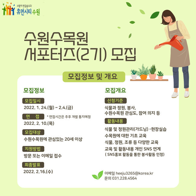 수원시공원녹지사업소가 2월 4일까지 ‘2022년 수원수목원 서포터즈(2기)’로 활동할 시민 50명을 모집한다.