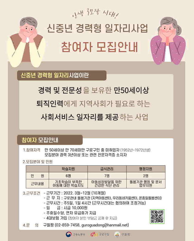 구로구 관계자는 “이번 사업을 통해 신중년에게는 생활 속 활력을 불어넣고, 사회서비스 기관에는 전문인력을 제공해 두 마리 토끼를 잡을 수 있다”며 “관심 있는 주민의 적극적인 참여를 바란다”고 전했다.