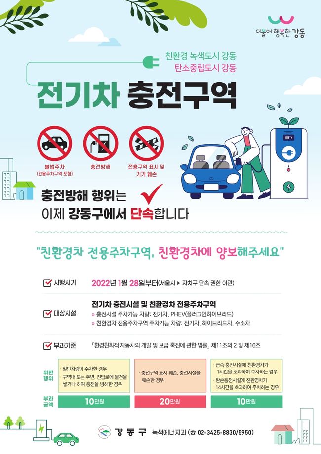 강동구는 오는 28일(금)부터 친환경자동차법 개정에 따라 전기차 충전방해 행위에 대한 자체적인 계도와 단속을 시작한다고 밝혔다.