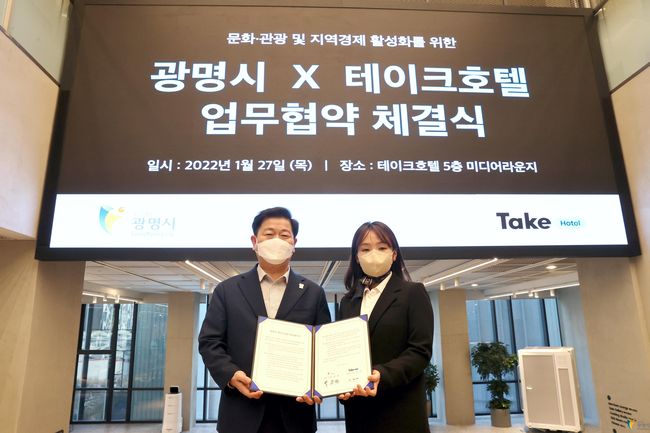 광명시와 테이크호텔은 지난 27일 테이크호텔 에서 ‘문화·예술·관광사업과 지역경제 활성화를 위한 업무협약’을 체결했다고 밝혔다.
