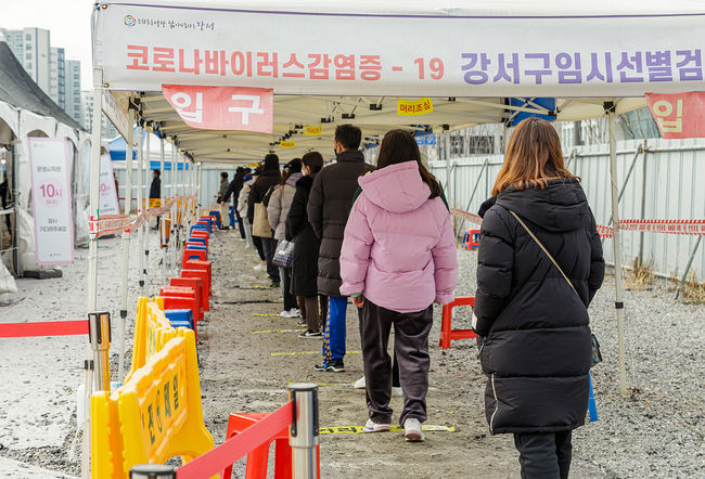 코로나19 신규 확진자가 1만 6천 명을 넘어서며 역대 최다치를 기록한 28일(금) 서울 강서구 마곡 임시선별검사소에 시민들이 코로나19 검사를 받기 위해 줄을 서서 기다리고 있다.