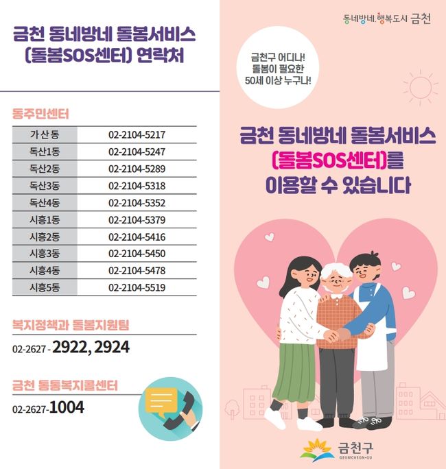 ‘금천 동네방네 돌봄서비스(돌봄SOS센터)’는 가족돌봄 기능의 약화로 생기는 돌봄 사각지대를 최소화하고자 2020년 8월부터 추진해온 사업이며, 갑작스러운 질병, 사고 등으로 긴급한 돌봄이 필요한 50세 이상 중장년·어르신, 장애인을 대상으로 한다.