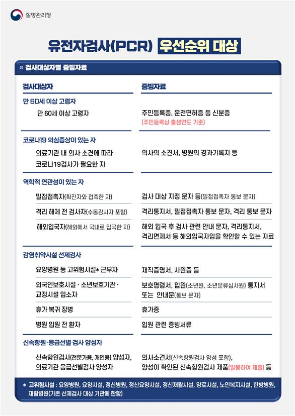 PCR 검사 우선순위에 해당하는 고위험군은 ▲만 60세 이상 고령자 ▲의료기관 내 의사 소견에 따라 코로나19 검사가 필요한 자 ▲역학적 연관성이 있는 자 ▲감염 취약시설 선제검사자 ▲신속항원 및 응급선별 검사 양성자 등이다.