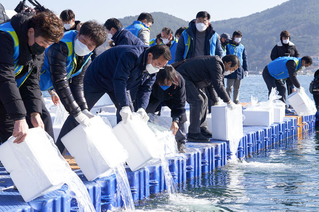 통영시는 (사)한국수산업경영인 통영시연합회 주관으로 광도면 죽림리 해역에서 어업인 소득증대를 위한‘대구자어 방류사업’을 1월 28일 추진했다.