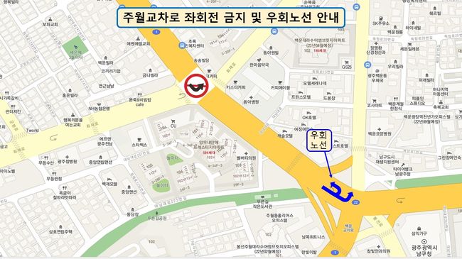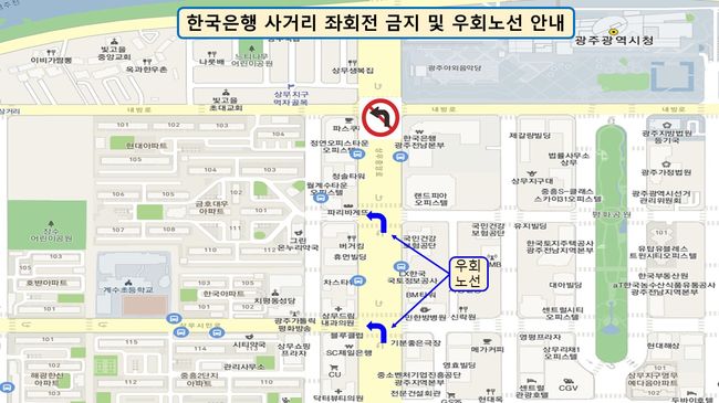 이에 따라, 좌회전이 금지된 상무중앙로 한국은행 사거리에서는 국민건강보험공단 및 SC제일은행 사거리에서 우회토록 하고, 주월교차로는 백운교차로에서 좌회전 및 유턴할 수 있도록 안내할 계획이다.