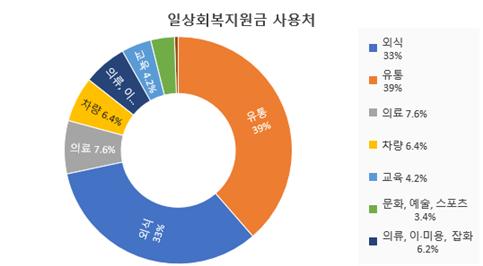 업종별 사용처를 살펴보면 유통(38.6%)과 외식(33%)이 가장 높았고, 병원과 약국(7.5%), 주유 및 차량관리(6.5%), 의류 및 이·미용(6.2%), 교육(4.2%), 문화·예술·스포츠(3.4%) 등이 뒤를 이었다.
