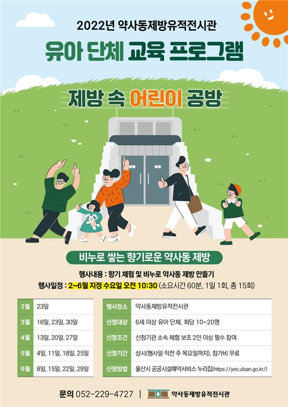울산박물관 산하 약사동제방유적전시관은 2월부터 6월까지 운영하는 유아 단체 교육 프로그램인 ‘제방 속 어린이 공방’의 참가자를 모집한다고 밝혔다.