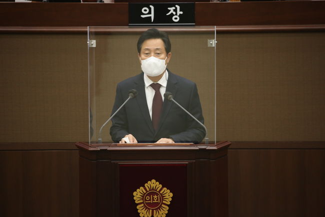 오세훈 서울시장은 7일 오후 서울 중구 서울시의회에서 열린 제305회 임시회에 참석해 서울시 업무보고에 나섰다.