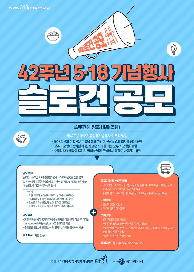 광주광역시는 5‧18민중항쟁기념행사위원회(이하 ‘5‧18행사위’)가 8일부터 28일까지 42주년 기념행사 표어(슬로건)을 접수한다고 밝혔다.