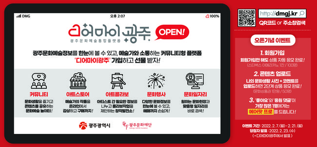 오픈 기념으로 진행되는 이벤트도 풍성하다. 이벤트 기간 ‘디어 마이 광주’에 회원가입만 해도 추첨을 통해 100명에게 아메리카노 1잔 교환권을 증정한다. 가입 후 문화생활 사진과 코멘트를 업로드 하면 50명을 추첨해 문화상품권 1만원권을 증정한다. 이중 가장 많은 ‘좋아요’와 ‘응원댓글’을 받은 1명에게는 에어팟프로를 증정한다.