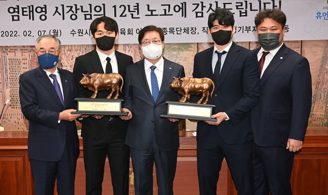 수원시에서 열린 ‘2022 설날장사씨름대회’에서 태백·금강장사를 거머쥔 수원시청 씨름단이 우승 트로피를 수원시에 봉납(捧納)했다.