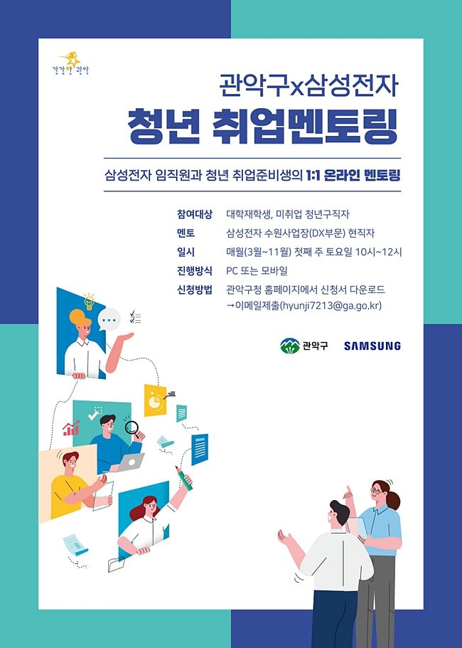 관악구가 오는 3월부터 11월까지 삼성전자 수원사업장(DX부문) 현직자의 재능기부로 취업컨설팅 및 진로상담 등을 지원하는 `관악구-삼성전자 청년 취업멘토링`를 진행한다.
