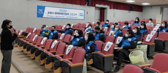 광명시는 행복마을관리소 확대 운영을 앞두고 올해 함께 할 행복마을지킴이를 대상으로 지난 7일 열린시민청(철산동 소재) 2층 강당에서 기간제 복무규정 4대폭력 예방 등 기본 소양교육을 진행했다.