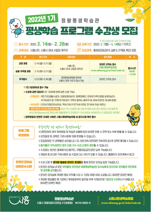 평생학습 도시를 지향하는 시흥시는 시민들에게 내실 있는 평생학습 기회를 제공해 삶의 질을 향상할 수 있도록 돕고자 오는 14일부터 3월 4일까지 2022년 1기 평생학습 프로그램 수강생을 모집한다.