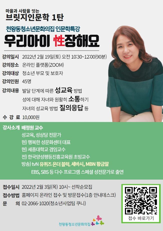 구로 천왕동 청소년문화의집이 자녀의 성교육으로 고민하는 가정을 위해 ‘우리아이 性장해요’ 특강을 펼친다.