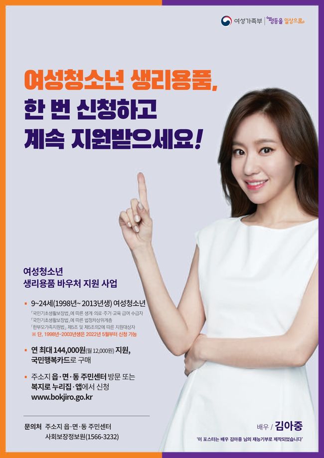 특히 올해 지원 대상 연령이 만 9~24세로 확대됐다. 기존 만 11~18세에서 대상 연령대가 대폭 확대되면서 더 많은 여성청소년들이 혜택을 받을 수 있게 됐다. 또, 지원 금액도 월 1만 1500원에서 1만 2000원으로 늘어났다.