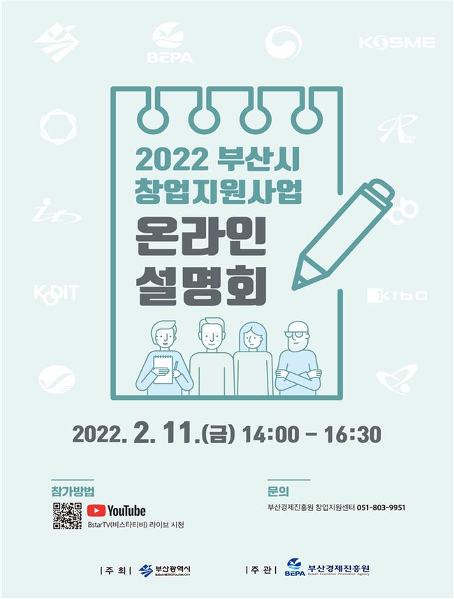 부산시는 오늘(11일) 오후 2시부터 4시 30분까지 2022년 부산 창업지원사업 온라인 설명회를 개최한다고 밝혔다.