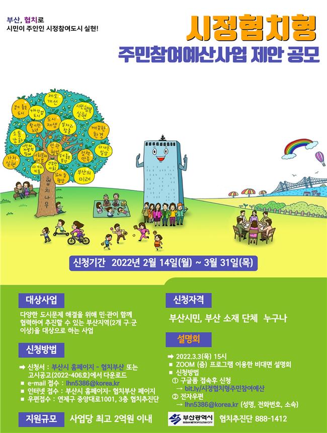 부산시는 내년도 주민참여예산 편성을 위한 ‘시정협치형’ 사업 제안 공모를 3월 31일까지 진행한다고 밝혔다.