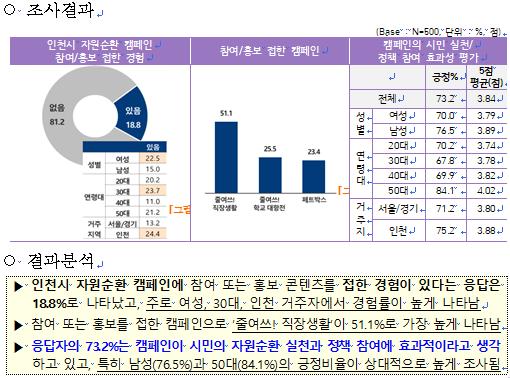 환경특별시로 자리매김하고 있는 인천시가 자원순환정책 인지도 및 인식을 확인하고, 홍보활동 평가를 위해 지난해 추진한 자원순환정책 홍보 만족도 조사를 실시해 그 결과를 발표했다.