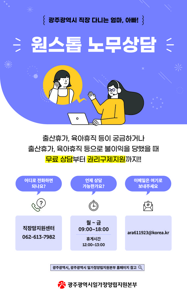 광주광역시 일가정양립지원본부는 직장맘·대디의 노동문제 해결을 지원하기 위해 다양한 정책을 펼치고 있다고 17일 밝혔다.