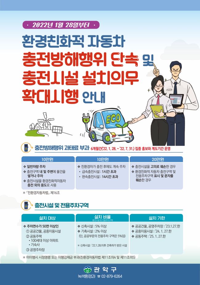 이에 구는 법 개정 사항을 구민에게 알리고 충전방해 행위에 대한 인식 제고를 위해 오는 7월 31일까지 6개월간 계도와 집중 홍보에 나선다.