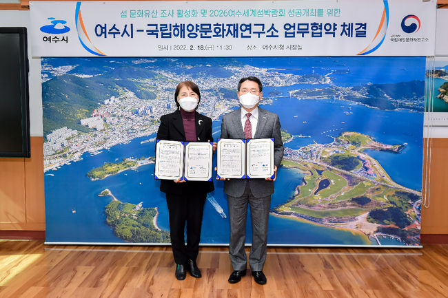 여수시는 18일 시장실에서 국립해양문화재연구소와 ‘섬 문화유산 조사 활성화 및 2026여수세계섬박람회 성공개최를 위한 업무협약’을 체결했다고 밝혔다.
