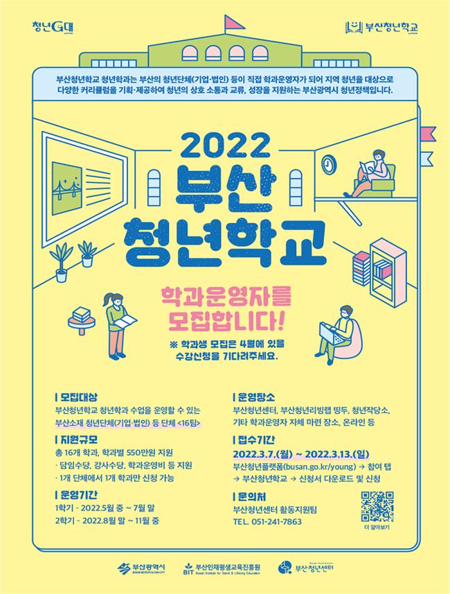 부산시는 청년들의 소통과 교류, 성장을 도모하는 2022년 부산청년학교의 청년학과를 운영할 민간단체를 3월 7일부터 모집한다고 밝혔다.