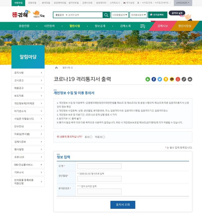 온라인 시스템은 지난 10일 이후 김해보건소에서 격리통보를 받은 시민에 한하여 발급이 가능하며 김해시청 누리집 알림마당 메뉴에서 격리통지서 발급 버튼을 클릭하고 성명, 생년월일, 전화번호를 입력하면 간편하게 확인할 수 있다.