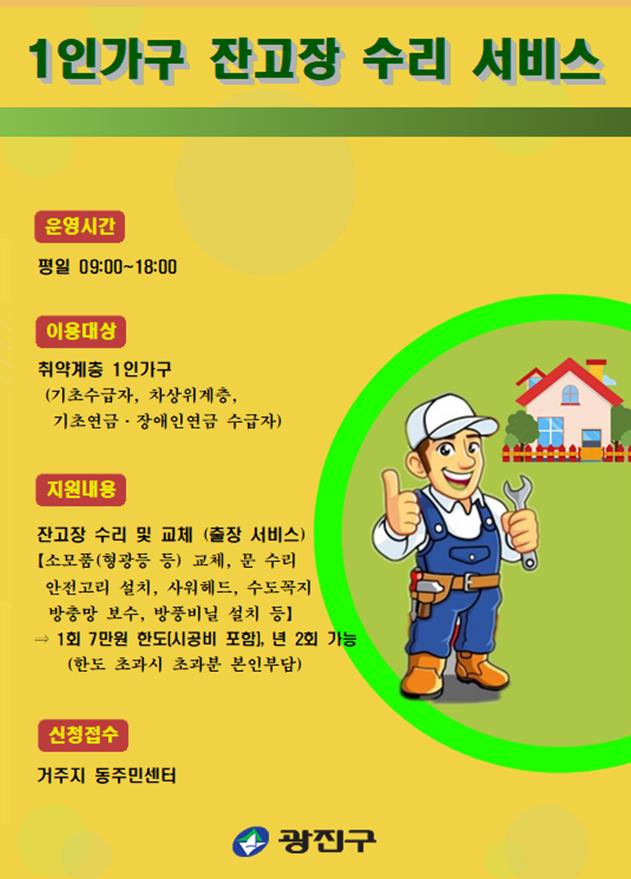 광진구가 올해부터 지역 내 철물점과 연계하여 취약계층 1인 가구의 주택 잔고장 수리비용을 지원한다.