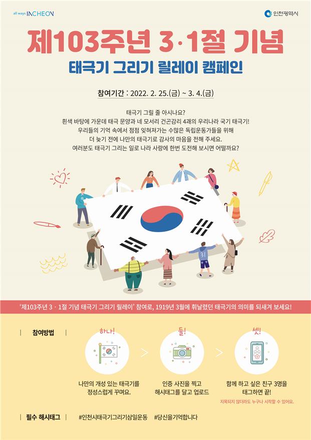 캠페인은 나만의 개성 있는 태극기를 그린 후 인증샷을 찍어 본인의 SNS계정에 업로드하고 함께할 친구 3명을 지명하면 되며, 인천 시민이면 누구나 참여할 수 있다.