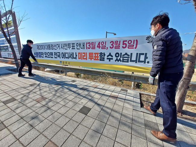 경주시 시정새마을과 직원들이 사전투표 안내 현수막을 게첨하고 있다.