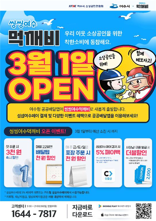 여수형 공공배달앱이 리뉴얼을 마치고 3월 1일 `씽씽여수 먹깨비`로 새롭게 오픈한다. 첫 주문 3천원 즉시 할인 등 매월 다양한 이벤트를 제공할 예정이다.