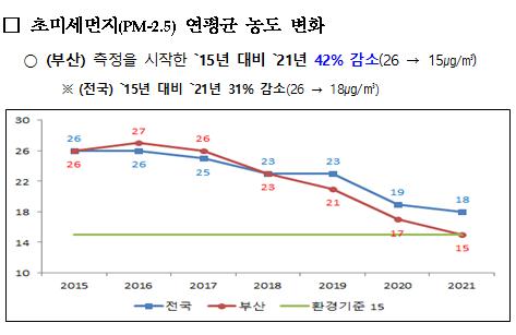 지난해 부산지역 초미세먼지 연평균 농도는 15㎍/㎥로 2015년 관측 이래 처음으로 환경기준을 달성했을 뿐 아니라 7대 특·광역시 중 가장 낮은 것으로 나타났다.