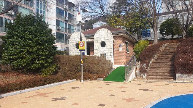유신공원 화장실은 2005년 설치 후 리모델링을 하지 않아 시설물이 노후된 상태였으며 화장실 경사가 급하고 출입구가 협소하여 휠체어 통행이 불가능했다.